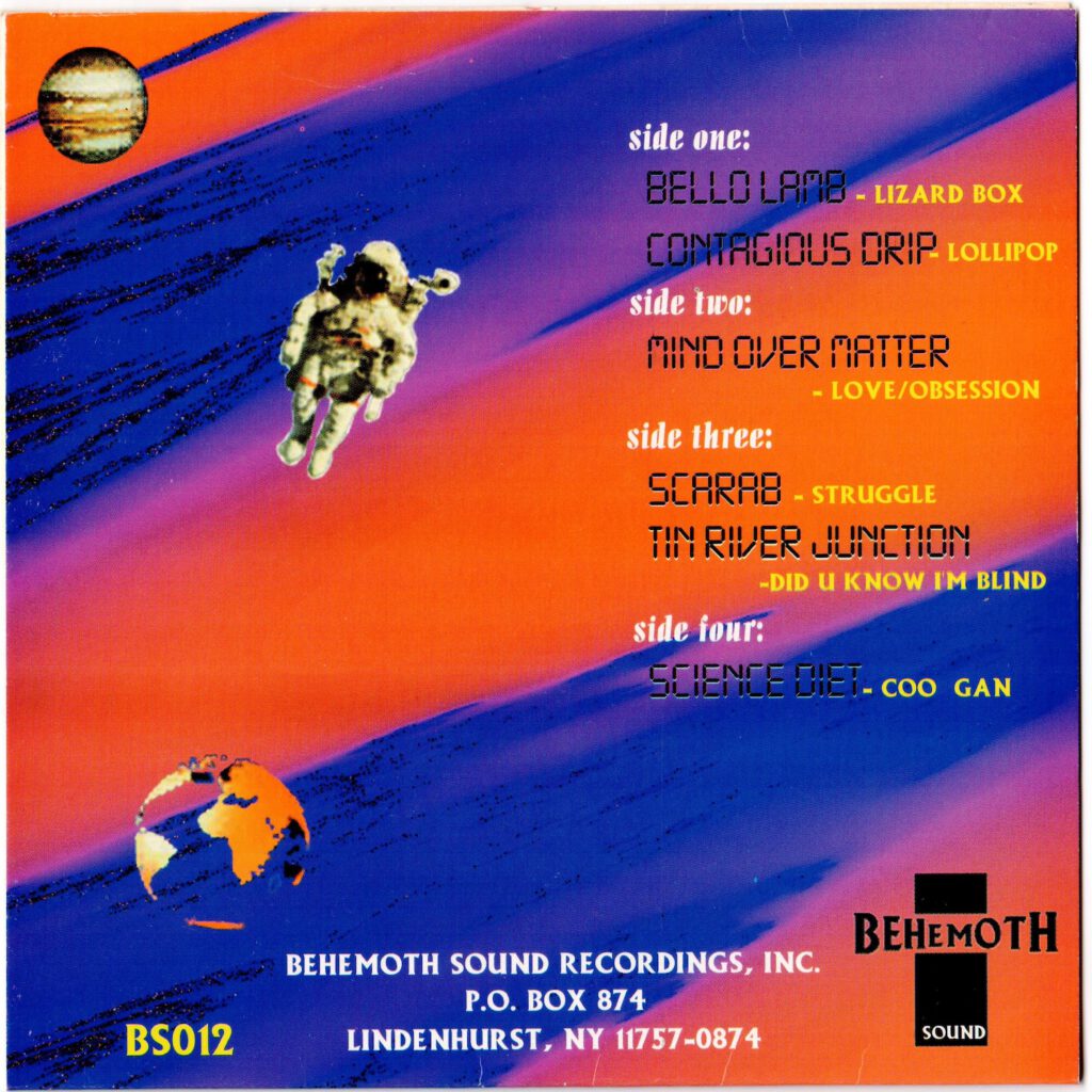 artist/song side a bello lamb: lizard box contagious drip: lollipop side b mind over matter: love obsession side c scarab: struggle tin river junction: did u know i’m blind side d science diet: coo gan